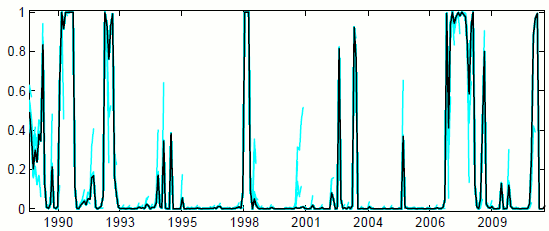 As we noted in the Introduction, the FSI was constructed and used by the Federal Reserve Board staff in real time during the financial crisis and recession. We have already demonstrated that the model shows switches to high-stress coefficient regimes in general, and stress events in particular, that coincide with well-known financial events in U.S. history. The usefulness of the index would be limited, however, if its performance in real time were substandard. Figure 4.4 examines this question, showing with the colored lines the (quasi-) real-time estimates of the state probabilities for the high-stress coefficient state; that is, the probability measured at each point in time based on information up to the current period..30 Two noteworthy conclusions may be drawn from this figure. First, the switches in coefficients indicated in ex post data, the black line, were revealed in the real-time estimates, the colored lines; that is, false negatives are negligible. Second, while there are hints of false positives-for example in 1996 and 2002-at no time did the real-time data adamantly call for a switch that was rescinded ex post.31 All in all, we would argue that the model does remarkably well in real time.