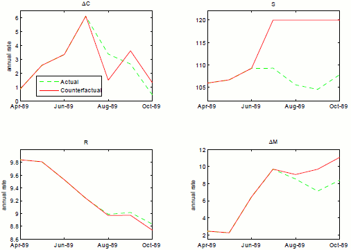 We begin with an autonomous increase in stress during a low-stress period in July 1989. Figure 4.5 shows the results. The noteworthy aspects are two-fold: first, the monetary response is slight, with the federal funds rate (