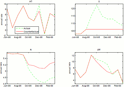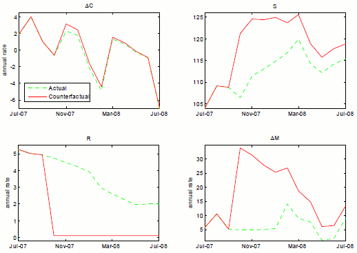 The message of this counterfactual is found in the lower-left panel where we see a substantial reaction from monetary policy offsetting the expansionary implications of the lower level of stress. This response is in sharp contrast with the previous experiment, carried out in low-stress conditions (with the opposite sign). The implications for real activity end up being quite modest, which would have been well advised at the time since PCE growth was quite strong, on average, during this time. What this says is that monetary policy, when it has the capacity to do so, is well disposed to respond to increases in stress, holding constant the stress regime, when those increases are moderate and temporary, as was the case in 1998. Arguably, actions by the Federal Reserve to elicit an orderly reorganization of LTCM ensured that this stress event was brief, and monetary policy defined in terms of setting the federal funds rate was in a position to ease. The contrast with the 2008-9 financial crisis is fairly stark. The shock in the latter instance was larger, as shown in Figure 4.3 the stress event lasted longer, and conventional monetary policy was limited in its ability to respond.
