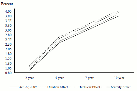 To illustrate the scarcity and duration effect of LSAP-style operations, we construct counterfactual yield curves obtained using the results in Table 5 for the nominal term premium. The resulting yield curves are shown in Figure 6. For simplicity, the counterfactual exercise starts from the actual yield curve as of October 29, 2009-at the conclusion of the first Treasury LSAP program-and treats all purchases ($300 billion) as concentrated in the two- to ten-year sector. In addition to the actual yield curve (solid line) that incorporates the effect of the first Treasury LSAP program, the figure plots the estimated yield curves that would have prevailed without the scarcity effect of LSAP (dotted line), without the aggregate duration effect (dashed line), and without either of these effects-i.e., the no-LSAP case (the combined dashed/dotted line). The scarcity effect is the largest for the five-year yield at about 23 basis points and is slightly smaller for the two- and ten-year yield at about 18 and 20 basis points, respectively. The aggregate duration effect is larger for longer maturities: it is about 6.5 basis points for the two-year yield; about 8.7 basis points for the ten-year yield.