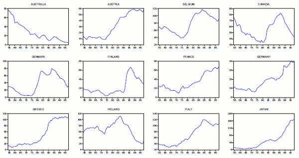 We use the post-war portion of the historical multi-country data set of (Reinhart & Rogoff, 2010) as our methods require a balanced panel and previous periods have numerous missing observations.8 Specifically, our annual sample runs from 1954 to 2008. The countries included in the data set are: Australia, Austria, Belgium, Canada, Denmark, Finland, France, Germany, Greece, Ireland, Italy, Japan, Netherlands, New Zealand, Norway, Portugal, Spain, Sweden, United Kingdom, and United States.