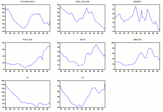 Table 1 provides summary statistics for GDP growth. The average annual GDP growth across countries is about 3.4% over the sample period. On average, GDP growth is slightly persistent and has an approximately symmetric distribution. Table 2 summarizes basic characteristics of debt to GDP ratio.9 Average debt to GDP across countries and over time is about 44%. The distribution of debt to GDP is right skewed for most countries in the sample. Unit root test results reflect high persistence in debt to GDP ratios. Only for two countries, Denmark and Sweden, the null of unit root can be rejected at conventional levels according to the point optimal test statistic of (Elliott et al., 1996). Debt to GDP ratios for individual countries are shown in Figures 1-2.