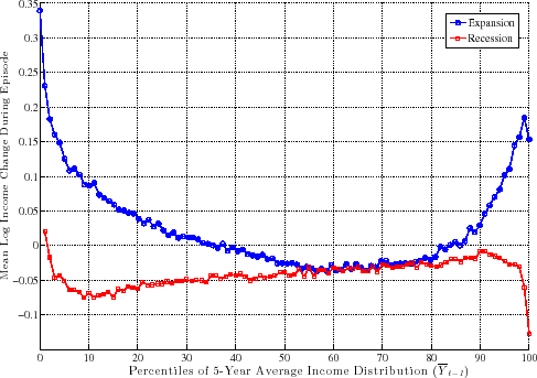 The spirit of our analysis is similar to the literature that decomposed wage inequality trends into between-group and within-group components (among many others, Juhn et al. (1993), Lemieux (2006), and Autor et al. (2008)). But there are several notable differences. First, our focus is on growth rates rather than levels, which is feasible with the panel dimension of our dataset. Second, we focus on business cycle variation, whereas that literature examined secular trends. Third, relying on repeated cross sections, that literature had to confine itself to observable characteristics that were available in the cross section, such as gender, age, education, and, sometimes, industry. With longitudinal data, we are able to define groups of individuals based on their history, such as individuals with high versus low past average earnings and/or earnings growth rates.