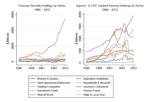 We take the investor types that are available in the Flow of Funds and construct eight investor categories for our analysis. Those categories are: the rest of the world, depository institutions (DIs), insurance companies, investment funds, pension and retirement funds, state and local governments, broker-dealers, and households. Much attention in popular press has been given to the amount of U.S. debt, especially federal debt that is held by foreign investors. As a result, the "rest of the world" category is of particular interest. Because the asset programs have resulted in a large increase in the quantity of reserve balances in the banking sector, understanding if DIs have sold assets to the Federal Reserve sheds some light on the evolution of banks' balance sheets over the course of the programs. Finally, it should be noted that the "household" category is perhaps a bit different than the label might imply. Given the conventions and information available in generating the Flow of Funds data, hedge funds are usually included in the "household" category. As a result, instead of reflecting the actions of "true" households which may be less sophisticated investors, this group in fact contains some of the more sophisticated investors who may be expected to arbitrage across markets.