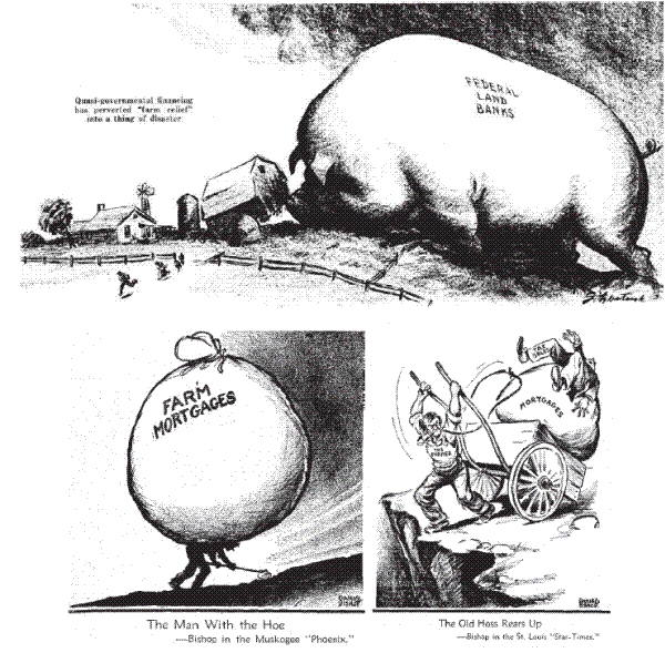 Both lenders encountered difficulties in the early 1930s, when reductions in farm land values and farm incomes (which are correlated by nature) led to a wave of farm mortgage loan defaults.6 Figure 1 shows some cartoons that convey farmers' deep discontent. These credit losses led to broad retrenchment by the portfolio lenders, and the complete collapse of the JSLBs after the federal government declined to bail them out, and in 1933 the JSLBs were restricted from issuing any new loans. The FLBs, in contrast, did receive a bail out through a capital investment from the Treasury, authorized by new legislation in 1932. Prior to this, the FLBs had been operating with the implicit--but not fully certain--backing of the federal government during the 1920s, reflected in the higher prices commanded by FLB bonds throughout the decade.7 Altogether, this institutional backdrop has striking similarity to the nonfarm residential mortgage market of recent years, in which portfolio lenders pulled back from the market, private mortgage securitizers failed, and institutions with implicit government support--Fannie Mae and Freddie Mac--were bailed out by the federal government.8