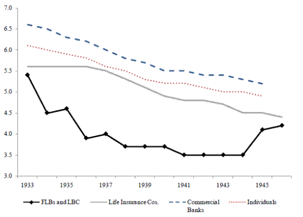 mortgage loans was 6.1 percent (Wickens 1932, p. 63), though there was significant regional variation, and President Roosevelt argued that interest rates "in many instances are so unconscionably high as to be contrary to a sound public policy."20 Figure 4 shows that, by the late 1930s, the average interest rate on FLB and LBC loans was below 4 percent, while rates on private loans still averaged above 5 percent. The difference in interest rates is