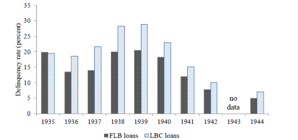 Delinquencies were a serious problem on FLB and LBC loans during the 1930s. Figure 5 graphs the delinquency rates on FLB and LBC loans respectively from 1935 to 1942. These rates were elevated throughout the second half of the 1930s but fell rapidly during the war years.