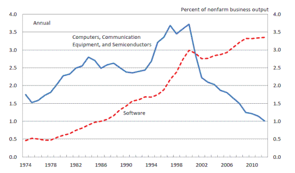 As for the separate contributions from the use of IT (capital deepening) and from efficiency gains in the productionof IT, the patterns are similar, with the contributions over 2004-2012 well off from the rapid pace during 1995-2004 and a little below the contribution from 1974 to 1995. The slowdown in the contribution from the production of IT reflects both a slower pace of advance of MFP in each IT sector and a sizable step-down in the current-dollar output share of the industries producing computer hardware, communication equipment, and semiconductors. This drop reflects substantial movement of IT manufacturing from the United States to foreign locations. Indeed, as shown in figure 1, the share of current-dollar nonfarm business output represented by the production of computer hardware, communication equipment, and semiconductors has fallen more than 70 percent from its peak in 2000.11 In contrast, the output share of the software industry was higher from 2004 to 2012 than in either of the earlier periods.
