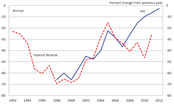 the price index barely fell at all in 2012. The PPI data, if correct, would indicate that a fundamentally adverse shift in semiconductor price trends has taken place over the past several years.