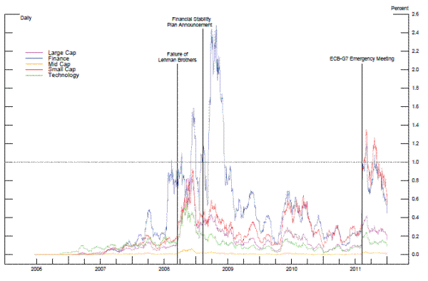 Panel A of Table 3 reports the summary statistics for various stock categories from June 2006 to December 2011. The financial category includes the members of the Russell 1000 Financial Services Index. Float-adjusted and unadjusted market capitalizations of an average financial stock are $10.1 and $ 10.9 billion, respectively. Daily volatility- the standard deviation of the previous 20 days' returns- of an average financial stock is 2.9%. There are 279 different stocks in this category with $125 million in average daily volume. The large stock category, which consists of the members of the S&P 500 index, has $21.3 and $22.3 billion in float-unadjusted and -adjusted market capitalizations, respectively. There are 647 different stocks in the large stock category with an average daily volatility of 2.3% and volume of $203 million. Going from the mid-cap stock category (Russell Mid-Cap) to small stock category (Russell 2000), market capitalizations and daily volume decrease. The daily volume of an average mid-cap stock and small stock are $ 60 million and $7 million, respectively. For an average small stock, float-adjusted market capitalization, $ 550.3 milion, is considerably different then unadjusted market capitalization, $ 652.4 million. Technology stocks, which are the members of the NASDAQ 100 index, have $ 22 billion in average market capitalization, roughly equal to that of large stocks8. Yet, the daily volume of an average technology stock ($303 million) is higher, suggesting that they are traded more actively. Panel B and Panel C of Table 3 report the same variables for 2006-2009 and 2010-2011 periods. Higher volatility in all stock categories, especially among financials, is notable in the earlier sample period due to the 2008-2009 financial crisis. Daily volatility of an average financial stock is 3.5% during 2006-2009 period and 2.0% during 2010-2011 period. Other stock categories have 70 to 80 basis points higher daily volatility in the earlier sample period.
