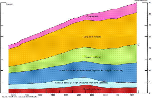 The main results are as follows. In the lead-up to the financial crisis of 2008, the domestic shadow banking system was a significant, but not dominant supplier of funding to the nonfinancial sectors of the economy. For example, nonfinancial-sector debt stood at about $34 trillion in the fourth quarter of 2008. Of that debt, I estimate that about $10 trillion was provided by the traditional banking system (either as direct loans or though holdings of securities) and $12 trillion was provided through traditional nonbank sources such as insurance companies, pension funds, and long-term mutual funds--sources that are not typically thought of as runnable. In contrast, only about $4 trillion was provided through short-term funding outside the traditional banking system. Thus, despite the well-deserved notoriety garnered by the shadow banking system, it did not account for a particularly large portion of nonfinancial-sector funding.
