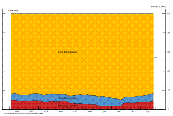 Note also that I include money funds in the short-term funder category. This does not mean that money funds are the only short-term funder. As I mentioned above, the short-term funder category is largely characterized by activities rather than by the entities themselves. The classification of money funds captures only the direct funding of the nonfinancial sector by the short-term funder. In practice, most financing from the short-term funder category comes indirectly through the runnable financing of intermediate funders.