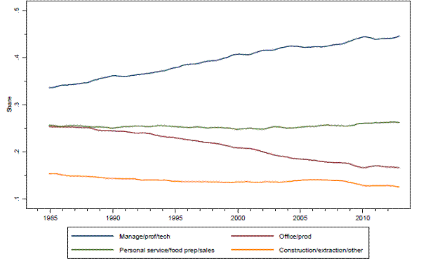 This division (routine, non-routine cognitive, and non-routine manual) is often chosen because it naturally maps into theories of the impact of technological change and/or globalization on labor demand. For instance, as computing power and automation technology becomes cheaper, and as it becomes easier to physically separate the act of production from product design, marketing, etc., then demand for routine occupations in the U.S. should fall, demand for non-routine cognitive occupations should rise (because workers in these occupations are made more productive by the cheaper technology and openness to new labor/product markets), and relative employment and wages for non-routine cognitive jobs should increase. Non-routine manual jobs, which are performed locally and are harder (as of yet) to substitute with machines or foreign labor, are not directly affected by these changes.7 Categorizing occupations in this manner also makes explicit that polarization is a cross-industry phenomenon, rather than simply an outcome of sectoral shifts (e.g. Foote and Ryan 2012, and Tuzeman and Willis 2013)--that is, polarization is not simply the outcome the long-run downtrend in manufacturing employment, but is also evident within industries.8