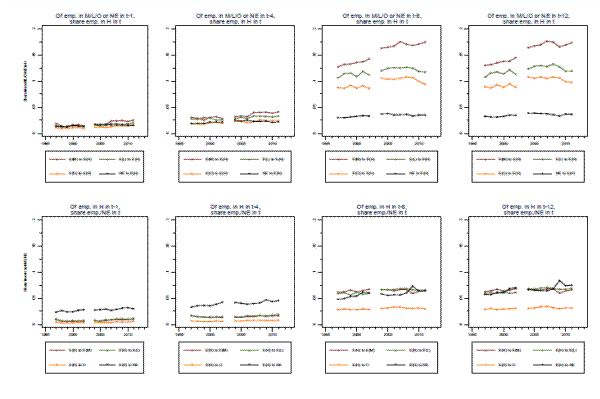 Similar to Figure 4, Figure 7 shows the probability that someone displaced from a job of a particular type at some point in the previous three years is observed employed (or non-employed) at the time of the survey. For instance, the middle plot of the top panel shows the probability that a person displaced from a high-, low-, or other-type job at some point in the previous three years was observed as employed in a middle-type job in year t. Conversely, the middle plot of the bottom panel shows the probability that a person displaced from a middle-type job was observed as employed in a non-middle-type job in year t.