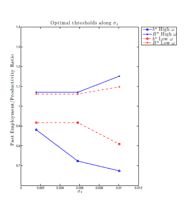 Panel (b) of Figure 1 displays the impact of variations in aggregate volatility on the optimal inaction regions. An increase in aggregate volatility