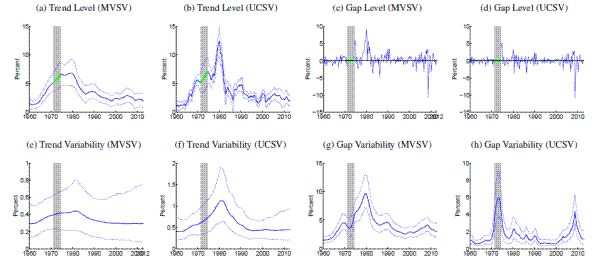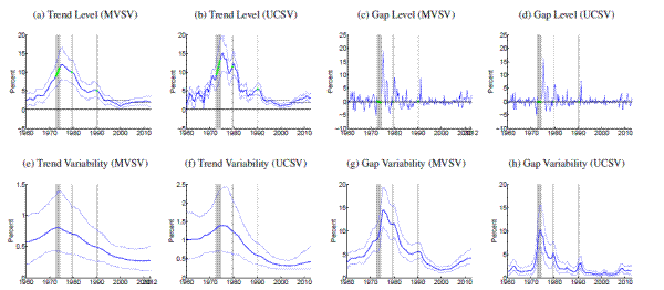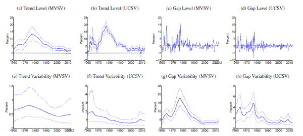 Moreover, our model incorporates time-varying volatility in both the trend and the gap component of inflation. The model thus nests the UCSV case. In our application, the model uses observations on inflation in headline CPI, core CPI, and the GDP deflator, stacked into a vector