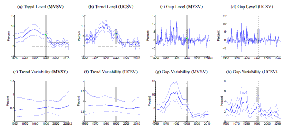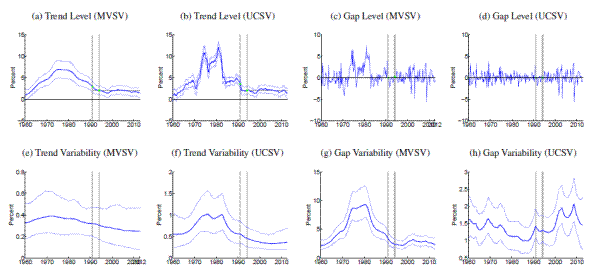 The filtered estimates presented here, are derived from a real-time analysis, where each model has been re-estimated for each quarter from 1984:Q4 through 2012:Q4.16 The difference between filtered and smoothed estimates incorporates thus also the effects of re-estimating the model's hyperparameters like