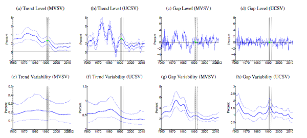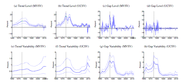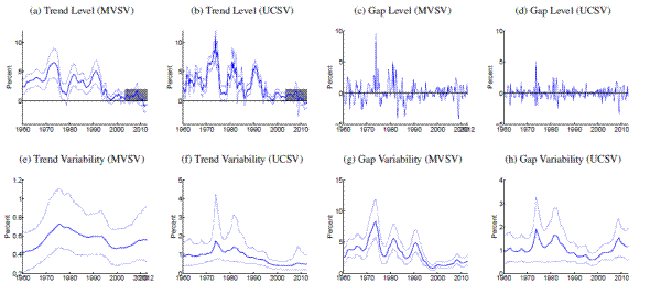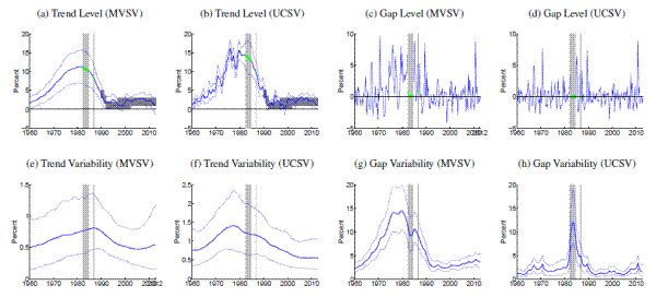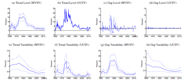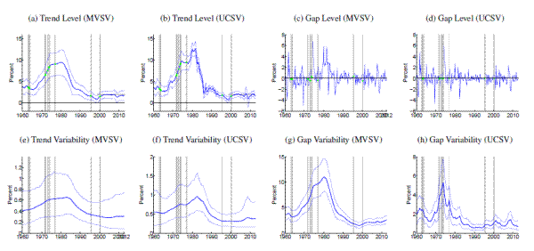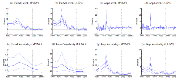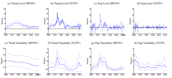 By contrast with the UCSV model, inflation gaps can be persistent in the multivariate model, provided they remain stationary. Specifically, the inflation gaps follow a stationary VAR with constant parameters and constant correlations and a common volatility factor: