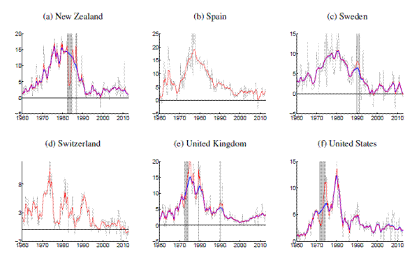 Our discussion is limited here to a subset of countries, for which the comparison brings out some particular differences between filtered and smoothed estimates. These countries are Australia, Canada, New Zealand, Sweden and the United Kingdom, and each of them is characterized by a disinflation period, preceding the formal adoption of an inflation targeting regime. (Results for all countries are shown in a separate appendix.)
