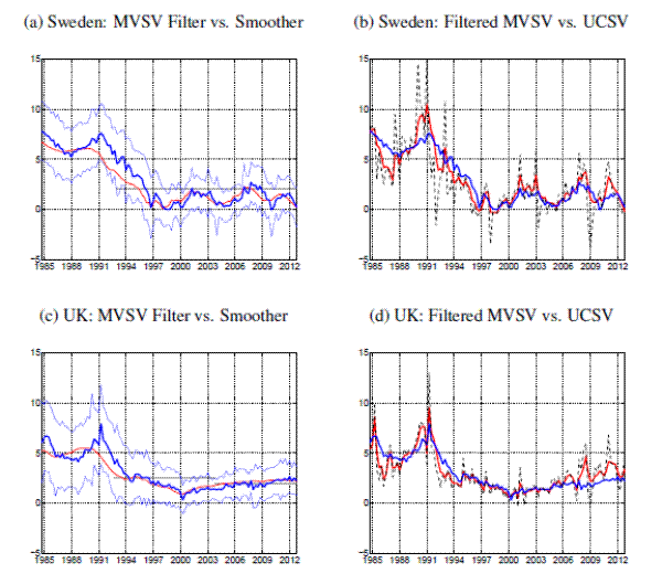 Filtered estimates from the UCSV and the MVSV model are shown in the right-hand side panels of Figure 18. These figures are thus analogous to what is shown in Panels (a) and (b) of Figures 1 through 14 for the smoothed estimates. While the filtered estimates are generally a bit more variable than their smoothed counterparts, the general message from comparing the trend estimates of the UCSV model and the MVSV model is the same as before: The UCSV estimates of the inflation trend take at times undue signal from transitory movements in the inflation data, and this phenomenon is visible in the figure as swings in the UCSV trend around the corresponding MVSV estimates.