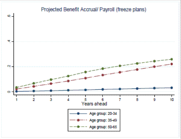 In Figure 2, we investigate the extent to which the cost savings is greater for certain age groups. The graph in the upper left shows the accruals for the freeze plans by age group, scaled by payroll, and the graph in the lower left shows the same accruals scaled by plan assets. At a 5-year horizon the youngest group would have had accruals of 2% of payroll, the middle group of 12% of payroll, and the oldest group 16% of payroll, for a total of 30% which closely matches the 5-year accruals shown in Table V.19 Over a 10-year horizon, the workers who were 20-34 at the time of the freeze have accruals of 4% of payroll, the workers who were 35-49 at the time of the freeze have accruals of 23% payroll, and the workers who were over 50 have accruals of 27% payroll, totaling the 54% of payroll shown in Table V.