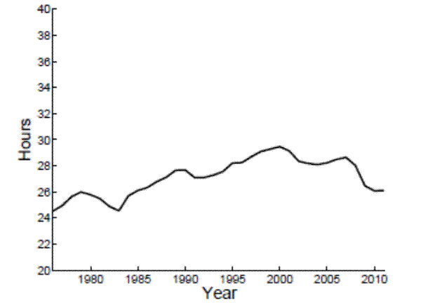 Modeling the labor shock through unemployment spells may not capture all changes in aggregate hours worked per working-age population during the Great Recession. Figure 2 plots the evolution of the aggregate hours worked in the economy (defined here as the total hours worked normalized by the total population between ages 20 and 69) since 1976. As can be seen in the figure, despite a general downward trend after 2000, the average hours