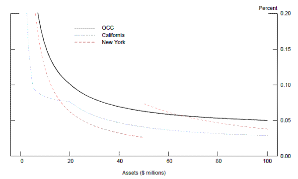 Figure 1 presents examples of how fees vary with bank charter and assets. This figure shows how the 2012 annual assessment fees as a percentage of assets vary with assets for banks with at most $100 million of assets chartered by the OCC, the California Department of Financial Institutions, and the New York State Department of Financial Services. The OCC's fees are larger than states' fees for most of the interval of assets shown in this figure. California's schedule of fees is kinked close to $5 million and at $20 million. The OCC's schedule is kinked at $2 million (not shown) and $20 million, although these kinks are not pronounced. New York's fees jump substantially at $50 million.