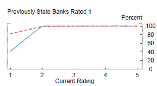 These graphs show two clear facts about examinations: good ratings persist over time and bad ratings are more likely to improve after banks switch charters. The graphs in the top two rows show that banks that were previously well rated tend to keep good ratings in future examinations, for any combination of charters as of the examination date and one year before. The first row shows that more than 99 percent of banks rated 1 in the previous examination are rated 1 or 2 in the current examination; the second row shows that more than 90 percent of banks rated 2 in the previous examination are rated 1 or 2 in the current examination. Still, the charts in the top row show that the odds that banks rated 1 keep these ratings if they switch charters are actually lower than if they do not switch. In particular, the top-right chart shows that these odds are twice as large for banks that held state charters one year before the examination and kept their charters as opposed to banks that switched to a national charter. This suggests that ratings tend to revert toward 2--the median and the mode of the distribution--when banks switch charters.