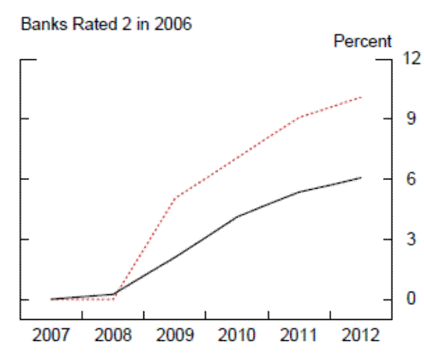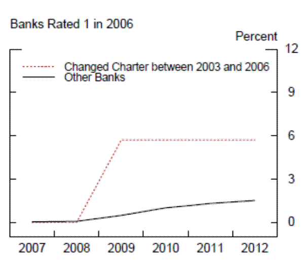 Moreover, banks can increase the odds of receiving good ratings by switching charters, not only because their new regulators can rate them better, but also because their new regulators may take longer to revise incoming banks' ratings than banks' previous regulators would. One such example is Silverton Bank, which was a state member bank that switched to a national charter in 2007 and failed in 2009. Silverton was rated 2 by its previous regulators, a rating maintained by the OCC in a pre-conversion examination in May 2007, right before the bank's conversion in August 2007, despite "significant weaknesses identified by OCC examiners" during this examination Department of the Treasury (2010a). This rating was kept constant until June 2008, when the OCC conducted its first full-scope examination on Silverton and assigned the bank a rating of 5. However, this examination occurred 17 months after the bank's last full-scope examination by the Fed, contrary to the requirement that a bank with Silverton's characteristics be subject to a full-scope examination at most 12 months after its last full-scope examination. An audit report from the Department of the Treasury (2010a) argues that this 17-month interval between full-time examinations was excessive and that the OCC should have deferred approval of this charter conversion until weaknesses identified in the pre-conversion examination were addressed.