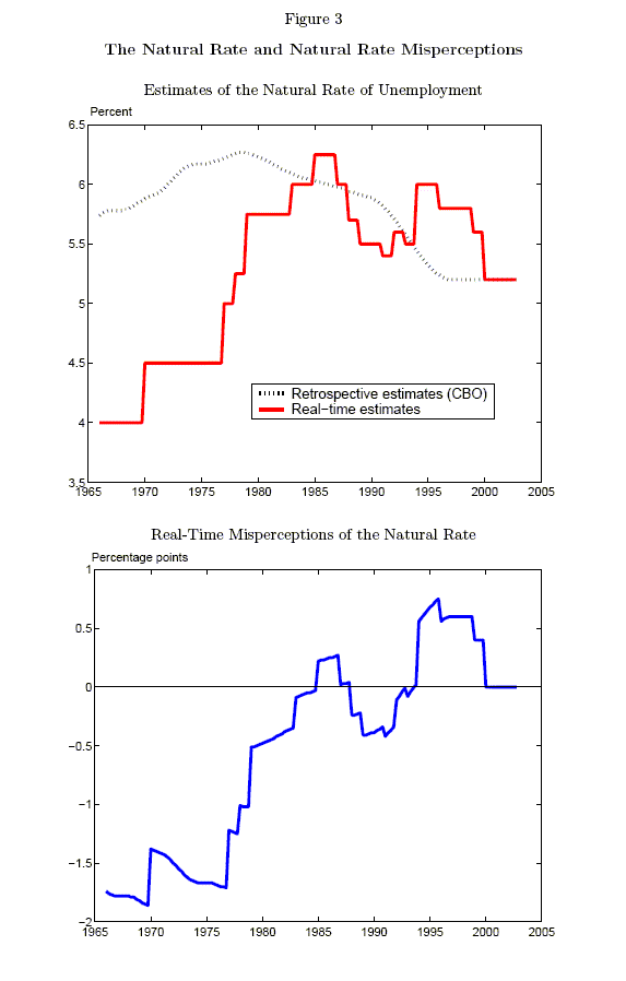 Comparison of the real-time perceptions likely held by policymakers at the time and our best current measures of the natural rate, then, provide a summary indicator of the potential policy errors that may be committed when an activist approach to stabilization policy is pursued. The top panel of Figure 3 shows our real-time and retrospective estimates of the natural rate of unemployment. The bottom panel of the figure plots the implied natural rate misperceptions--measured as the ``true'' value minus the real-time estimate--from 1965 through 2003. As seen in the figure, natural rate misperceptions have tended to be highly persistent. The first-order serial correlation of this series over this sample is 0.98. Interestingly, the average magnitude of real-time misperceptions has declined over the past several decades. This appearance of diminishing errors may be overstated, however, because these calculations of ``errors'' implicitly assume that the current CBO method of estimating the natural rate is correctly specified. The real-time and retrospective estimates in the latter part of the sample have been constructed by the CBO using a consistent methodology, while the ``misperceptions'' in the earlier part of the sample also reflect changes in methodology. If the current methodology used by the CBO proves to be inadequate, then the difference between real-time estimates and retrospective estimates in the 1980s and 1990s may widen in the future.9
