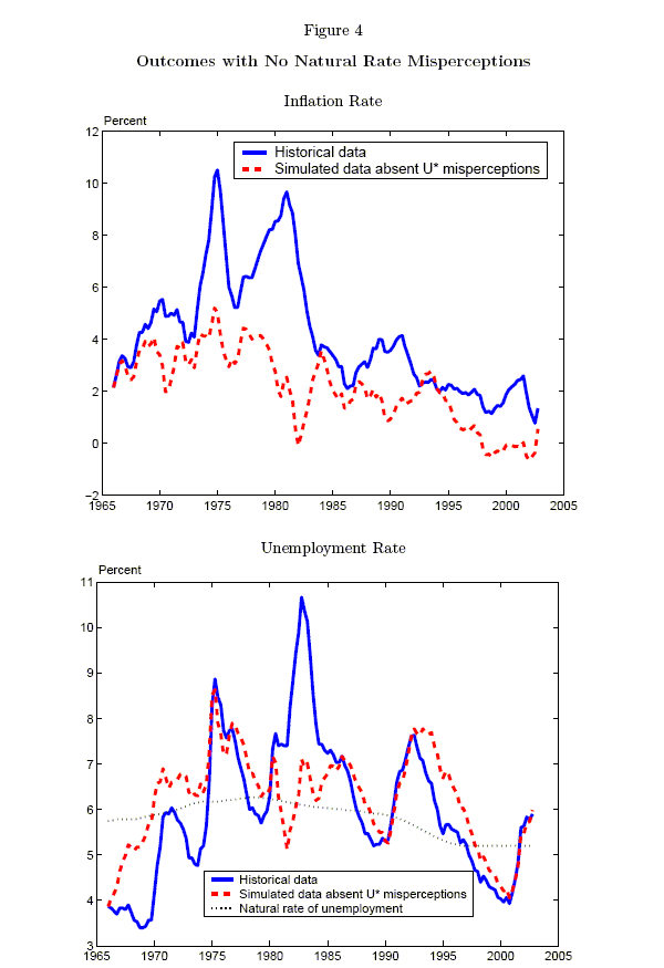 Notes: The two panels show historical and simulated paths of the rates of inflation and unemployment. The solid lines show the historical data. The dashed lines show the simulated paths assuming that the monetary policymaker knows the true value of the natural rate of unemployment in real time. Each simulation starts in the first quarter of 1966.