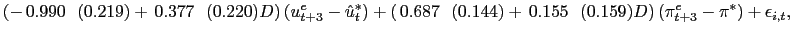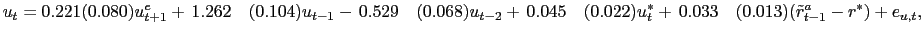 The numbers in parentheses are the estimated standard errors of the corresponding regression coefficients. The estimated unemployment equation also includes a constant term that provides an estimate of the natural real interest rate plus the average premium of the one-year Treasury bill rate we use for estimation over the federal funds rate, which corresponds to the natural rate of interest estimates we use in the model. If this premium equals the average difference between the one-year rate and the federal funds rate during this sample, then the estimation suggests that the natural rate of interest in this sample is 3.2 percent. To complete our model for simulations, we impose the expectations theory of the term structure whereby the one-year rate equals the expected average of the federal funds rate over four quarters.