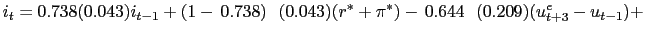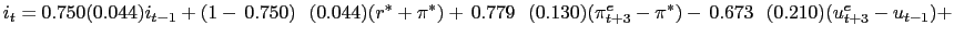 The point estimates suggest that in addition to the larger response to the perceived unemployment gap, policy in the first subsample was also somewhat less responsive to the inflation forecast. The difference in these estimates from our baseline specification is small, however, and does not qualitatively influence our simulation results. Return to text