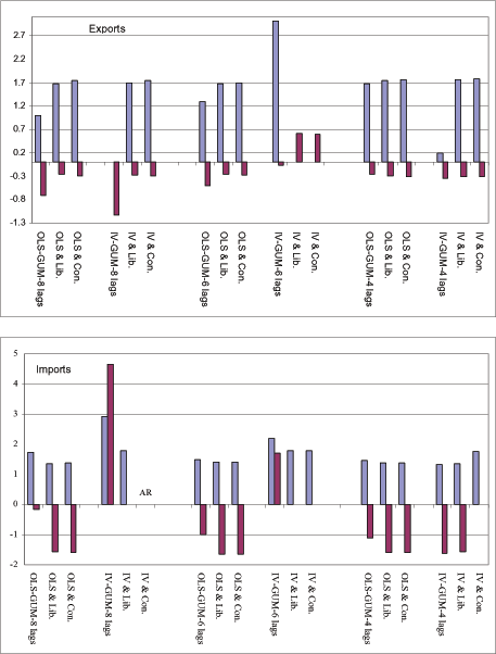 To compute the aggregate of income elasticities for imports I use equation (12); I also compute the corresponding aggregate for the price elasticities. The results indicate that the income elasticity of the aggregate equation is higher than the aggregate of the income elasticities from the disaggregated equations (figure A10). In other words, aggregation is biasing the income elasticity upwards. Again, the aggregation bias is significant only for FIML. For the price elasticity, the results indicate that the estimate for aggregate imports is significantly different from the estimate based on the aggregation of service-specific categories (figure A11); the direction of the bias is sensitive to the estimation method.