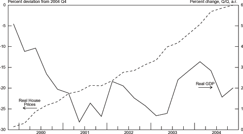 Nowhere has the debate been more public than in the United Kingdom, where house prices have almost tripled over the past nine years, with the largest gains occurring from late 2001 through the first half of 2004 (chart 4.2, upper panels). Starting in November 2003, the Monetary Policy Committee (MPC) of the Bank of England gradually raised the repo rate 125 basis points, to 4.75 percent. In its minutes and in most members' speeches that address those rate increases, the MPC states that it looks at house prices (and asset prices more generally) only to the extent that they provide information relevant to future output growth and inflation.19