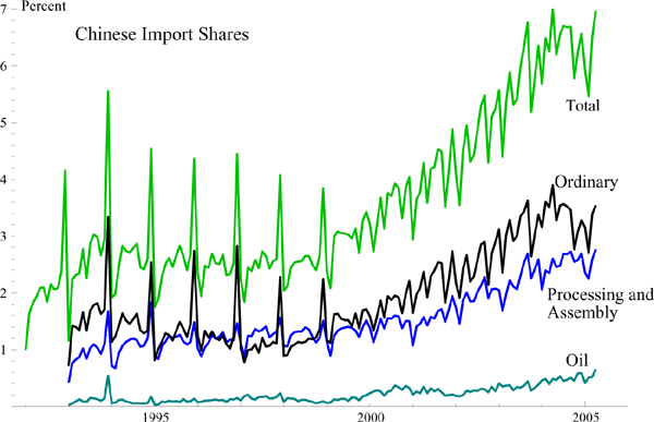 Overall, these papers offer two important lessons that we adopt. First, one needs to use data starting in the 1990s and exclude the period when China's trade regime was being transformed from state controlled to market oriented. To recognize this consideration, we use monthly data from 1992 to 2004. Second, disaggregation of trade matters for estimation. Indeed, the papers reviewed here find that separating imports for domestic use from imports used for assembly of products for exports influences significantly the characterization of the behavior of China's trade. The existing literature also offers a challenge: is it possible to obtain a useful characterization of Chinese trade that does not rely on proxies for prices?