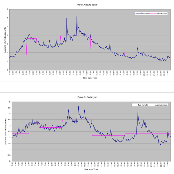 In both currency pairs, the patterns of trading volume are characterized by sharp spikes. For euro-dollar as shown in Panel A, the two spikes occur around 8:30 a.m. (New York time) when most U.S. macroeconomic data are released, and 10 a.m. (New York time) when most foreign exchange options expire. Another spike occurs at 11 a.m. (4 p.m. London time), the time of the Reuters fixing often used to express international bond and stock indices in dollars. For dollaryen in Panel B, the same three spikes in volume occur as in euro-dollar. The tallest spike in dollar-yen trading volume occurs around 7:55 p.m. New York time (9:55 a.m. Tokyo time), however, marks the daily fixing in Tokyo by Bank of Tokyo Mitsubishi.