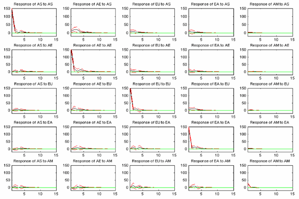 This figure shows the effect of a one-standard deviation shock to the innovations in volatility of one region on day t on itself and the other regions for days t+1 through t+15 (3 weeks). The impulse response functions are shown in solid lines, and the two-standard error bands are shown in dashed lines. The two-standard error band is computed from a bootstrap with replacement for 2,000 repetitions. The ordering of the system of equations is Asia (AS), the Asia-Europe overlap (AE), Europe (EU), the Europe-America overlap (EA), and America (AM).
