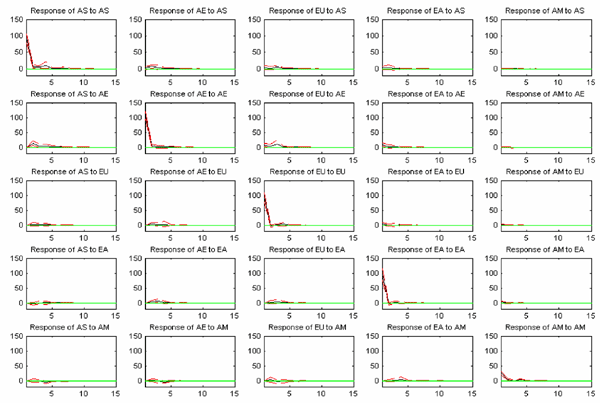 To evaluate the economic importance of the heat wave effect (own-region past volatility) and the meteor shower effect (other region's past volatility) in explaining each region volatility persistence, we simulate our system of equations to examine the impact of a one-standard deviation shock to the innovations of volatility in each region on current and future values of itself and other regions. The ordering of our endogenous variables follows the actual starting of trading time for each region, with Asia Pacific starting first and America starting last. Figures 6 and 7 show the impulse response functions for euro-dollar and dollar-yen volatilities for 15 days (3 weeks). Columns of each figure represent dependent variables, while rows represent shocks of a one-standard deviation to independent variables. For example, the impact of a one-standard deviation shock from the Asia-Europe overlap trading region to Europe trading region is shown in the third column of the second row. The impulse response functions are shown in solid lines, and the two-standard error band is shown in dashed line. The two-standard error band is computed from a bootstrap with replacement for 2,000 repetitions. Consistent with results on the Wald test statistics for heat wave and meteor shower hypotheses shown in Tables 1 and 2, Figures 6 and 7 provide evidence for both heat wave and meteor shower effects. The meteor shower effect is most pronounced between the originator of a shock region and the consecutive region, as shown in the boxes to the right of the diagonals. The heat wave effect, however, is economically much more important than the meteor shower effect, indicating by the size and the persistent of the responses on the diagonals as compared to the off-diagonals, similar to results in Melvin and Melvin (2003).