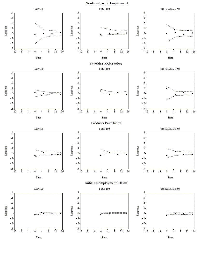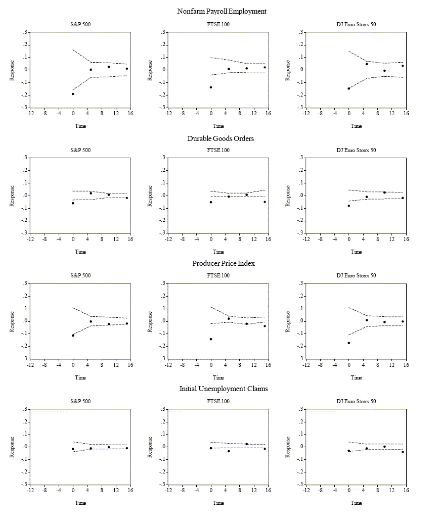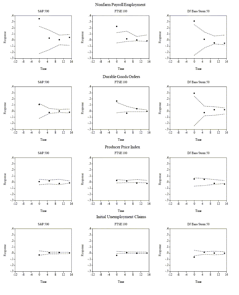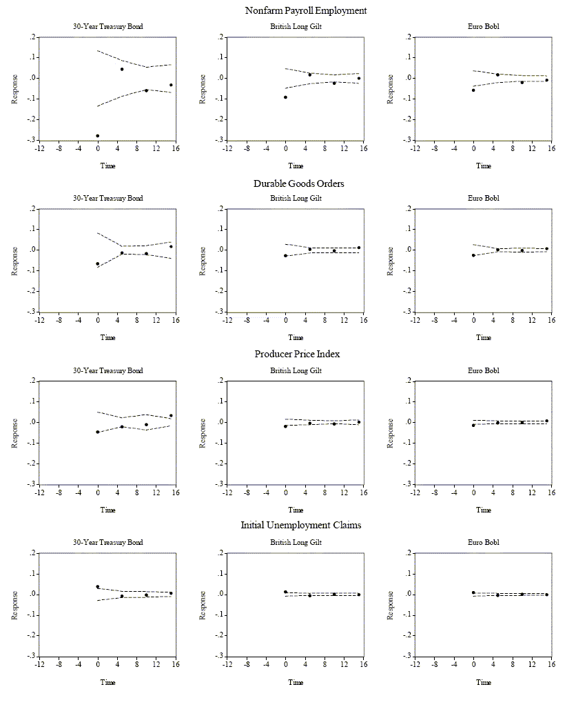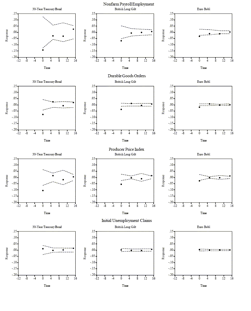 The average five-minute return for each of the nine markets is, as expected, extremely close to zero. However, the (absolute) size of the largest five-minute returns is noteworthy, with the extreme return event being about ten standard deviations or more removed from the sample mean for all markets. For the S&P500 and the DJE these extreme moves exceed two percent. This immediately suggests that macroeconomic news does move the markets.5 The summary statistics confirm the usual rank ordering in terms of volatility, with stock markets being the most volatile, followed by foreign exchange rates, and then fixed income. The only exception to this rule is the U.S. T-Bond market, for which the unconditional return standard deviation actually exceeds the standard deviations for the three exchange rates. This is likely a consequence of the fact that the T-Bond market, as discussed further below, reacts most strongly to macroeconomic news.