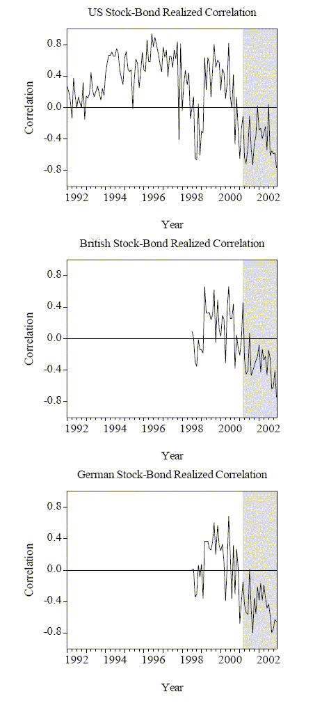 Notes to Figure 2B: We graph the monthly U.S., British and German stock-bond realized correlations, as detailed in the main text, from January 1, 1992 through December 31, 2002. The shaded area corresponds to the U.S. contraction sample from March 1, 2001 to December 31, 2002.