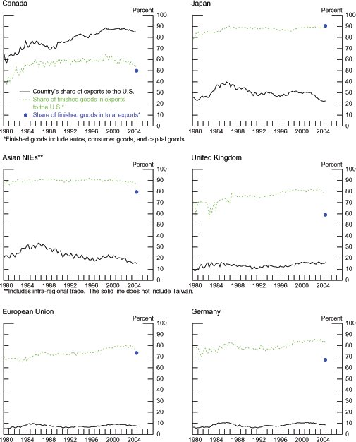18. For example, we find that over the past decade, a 10 percent depreciation of the dollar has typically raised U.S. finished-goods import prices 3 percentage points less than has been the case for other U.S. non-oil import prices. (Footnote 24 provides details regarding the regression specification used to obtain these results.) Return to text