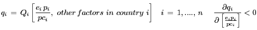 where all three variables (the price of the good, the firm's marginal cost, and the competitor's price) are now expressed in terms of the currency of country i.