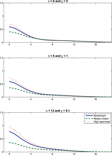 7. In these experiments, we vary openness by changing the share parameter in the NCES aggregators used to produce consumption and investment from the home and foreign goods. Return to text