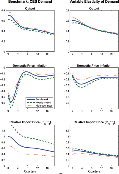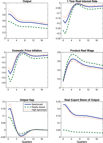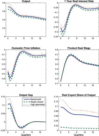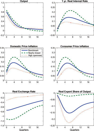 The similarity in the responses of output, domestic price inflation, and the real interest rate is mainly attributable to two factors. First, the interest-sensitivity of aggregate demand only rises slightly as trade openness increases. Although our benchmark calibration imposes a rather high long-run trade price elasticity of 1-1/2, providing a strong channel (through the uncovered interest parity condition) for real interest rates to influence exports, private absorption has a comparable interest-sensitivity due to the high responsiveness of investment. This can be garnered from the bottom panels of the figure: exports only contract a bit more sharply than private absorption in response to higher real interest rates. This helps to explain why output only shows a slightly larger contraction under a 35 percent trade share than in the case in which the trade share is only 1 percent of GDP. 8 The second factor is that desired price markups and real marginal costs do not change significantly with greater openness, so that domestic price inflation responds very similarly across the different calibrations. Overall, these results do not indicate a significant quantitative "steepening" of the Phillips Curve due to greater openness in response to this particular shock.9