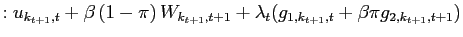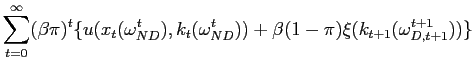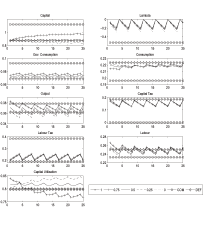 The time-inconsistency of this problem appears in Eq. (2). Today's household decisions depend on the expectation of future variables. In particular, the contemporaneous capital accumulation decision depends on future returns on capital. It is important to note that Eq. (4) is stating that the current capital tax is distortionary. If the planner would raise capital taxes, households could choose a lower capital utilization rate.3 This feature is important for our model because if the planner does not keep his past promises and the capital utilization is fixed, then the capital tax could be set at an extremely high and implausible value. Martin (2007) showed that with fixed capital utilization, and for plausible calibrations, an equilibrium under discretion does not exist. There may be other reasons that inhibit the planner to choose an extremely high capital rate when it defaults, we chose this specification that guarantees the model to have a well defined solution for the commitment and discretion case.
