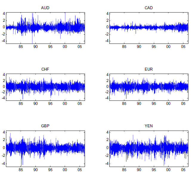 3. The March 8, 1983 big move in the Australian dollar follows the March 5 (Saturday) Australian legislative election, when the ALP, with Bob Hawke as leader, wins with one of the biggest parliamentary majorities in Australian political history (http://en.wikipedia.org/wiki/1983_in_Australia). February 19 and 21, 1985 is the so called " Australian Defense Crisis" when the Prime Minister withdraws from a firm commitment for Australia to help the United States in monitoring intercontinental ballistic missile tests (http://www.unisa.edu.au/hawkecentre/library/anniversary/1985.asp). On December 9, 1983 (Tuesday), the Australian Dollar is floated, by Federal treasurer Paul Keating. Under the old flexible peg system, the Reserve Bank bought and sold all Australian dollars and cleared the market at the end of the day (http://en.wikipedia.org/wiki/1983). Although there was no big exchange rate change on that date, we introduce a dummy in the conditional mean and variance (equal to 1 until December 8, 1983 and 0 afterward) to catch this regime shift. We are also deleting 9/14/81, 10/8/82, 2/13/91,11/19/92, which are dates for which Swedisk krona absolute returns were greater than 5 percent. The krona was used in an earlier version of the paper. Return to text