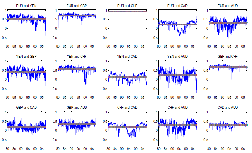 The copula approach has been used extensively in the literature. Other work in this area includes Dias and Embrechts (2003), who also look at the dynamic dependence between the Deutsche mark and the Yen. They look at data at different frequencies (two, four, eight, twelve hour and one day periods). They find that the dependence structure is not constant over time in all these time aggregation frequencies. Jondeau and Rockinger (2006) use an exogenous variable to explain changes in the dependence structure between stock markets over time. They find that an increase in volatility in the U.S. stock market usually increases the correlation between U.S. and a number of European stock markets. They also find that the dependency between European stock markets increased significantly between 1980 and 1999, while it did not change significantly between European and U.S. stock markets. Okimoto (2008) uses a copula approach to analyze the presence of two regimes in the U.K. and U.S. stock markets: a high dependence regime with low and volatile returns and a low dependence regime with high and stable returns.