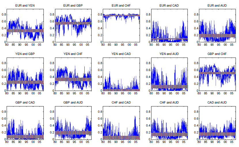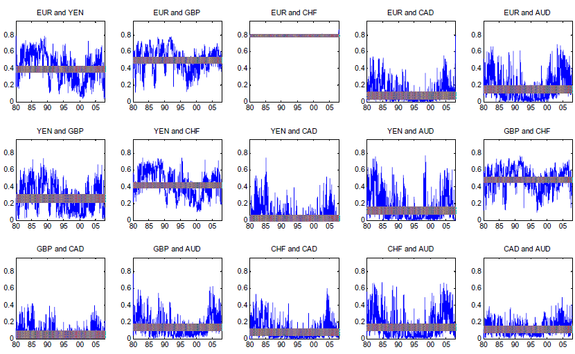 11. We estimated 15 copula models from the six exchange rates, which made 15 different pairs. Due to very high collinearity we had to discard the estimates for the Swiss franc (CHF) - euro pair, so from here on we only report estimates from 14 pairs of copulas. Return to text
