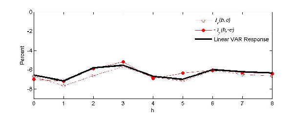 15. Hamilton (2003, Figure 14) provides an estimate of the impulse response function eight quarters ahead based on a single-equation nonlinear reduced-form model designed for one-step-ahead prediction (see p. 392). That estimate suffers from three problems that make it unsuitable for our purposes. First, in constructing the impulse responses Hamilton imposes that the net energy price increases are strictly exogenous. That assumption is unnecessarily restrictive and has been shown to be economically and empirically implausible (see Kilian 2008b,c). Second, Hamilton's model omits the contemporaneous regressor in constructing the impulse response function. Third, Hamilton ignores the nonlinear nature of the model in computing the impulse response function. Return to text